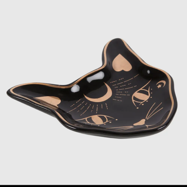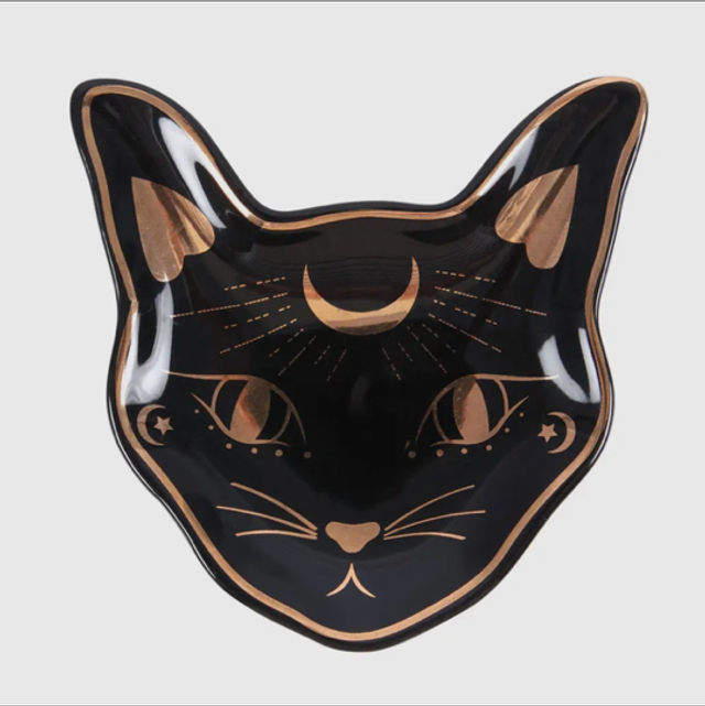 This trinket dish comes in the shape of a mystical cat face with gold foil accents. Perfect in size for holding pendulums, rings and other precious trinkets.