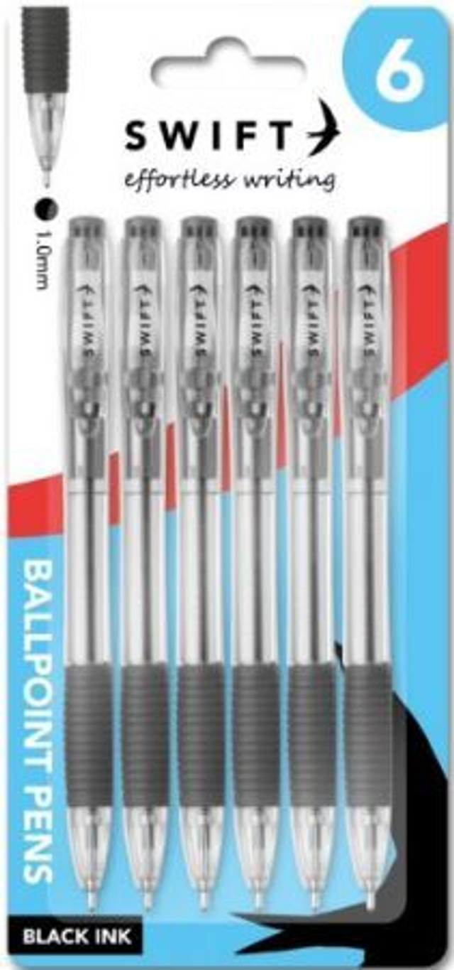 Retractable ballpoint pens, 1mm tip, pack of 6, black