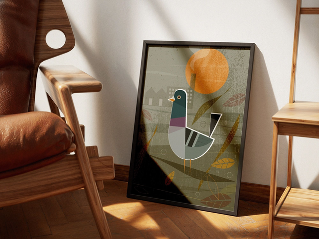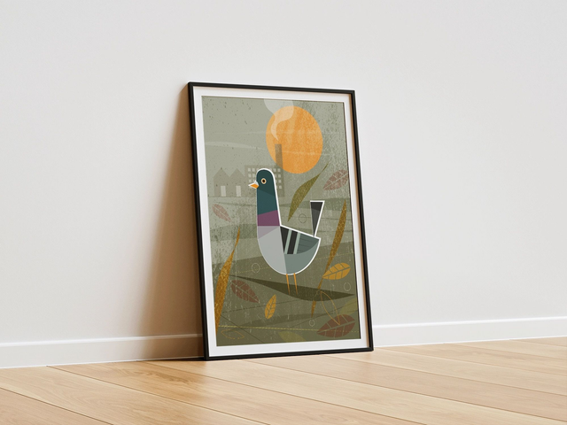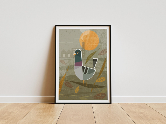 An original Illustration of an Urban Pigeon stood on waste ground with a factory in the background. Designed in a retro 1960s Mid-century style.